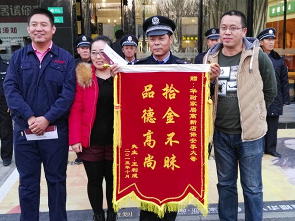 2015年10月23日18是許,保安李明寶在當(dāng)日營業(yè)結(jié)束清場檢查時,在張家口華耐高新店商場南區(qū)3層衛(wèi)生間撿到1只皮挎包,立即教到物業(yè)部值班室,經(jīng)值班人員共同檢查,內(nèi)有包括汽車鑰匙、多張信用卡、駕駛證等物品。19時30分,失主前來尋找。次日上午,為感謝李明寶,失主專程送來“拾金不昧,品德高尚”錦旗一面。